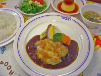 セットに、ライス、スープ、サラダ、そして大好評のプリンも付いています。(プリンは、ファンのお客様が結構います。)