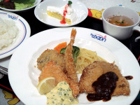 今日のランチは「ミックスフライ定食・730円」です。ボリューム感がいっぱいですね!手作りのタルタルソースにレモンを搾ってどうぞ。ライス・スープ・サラダ・デザートがついています。