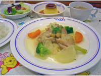 全体的な味は、白ワインのなんともいえないこくがあり、やみつきになる人が出てくるかもしれません?!ライス・サラダ・スープ・プリンがセットで730円になっております。