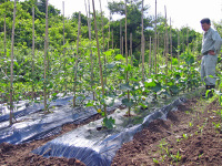こちらの畑は、鑑賞稲を栽培している奥にある畑です(7月6日の撮影)。6月中にトマト・キュウリ・ピーマン・ナス・トウモロコシの苗を植え、早くも実をつけはじめました。