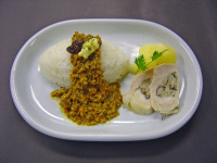 今日のおススメランチは、キーマカレー鶏のファルス(きのこ詰め)添え(730円)です。