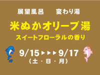 9月15・16・17日(土〜月)は、展望風呂 男女岩風呂で『変わり湯 米ぬかオリーブ湯』を実施いたします。皆様のお越しをお待ちしております。