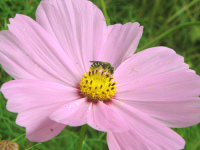 こんにちはTakahashiです。写真はトレーラーハウス近くで見つけたコスモスです。ふと気がついたらミツバチが仕事をしていたので撮ってみました。ご苦労様・・・。