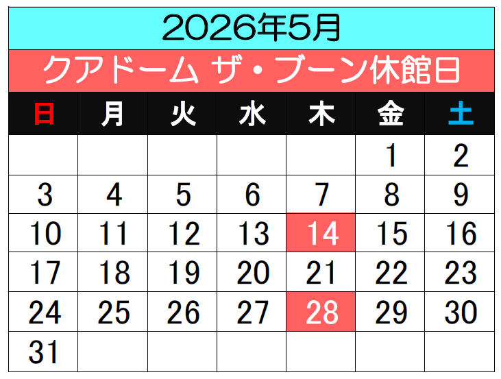 - 上記日程において施設メンテナンスのため休館いたします。お客様におかれましては大変ご迷惑をおかけいたしますが、何卒ご了承お願い申し上げます。