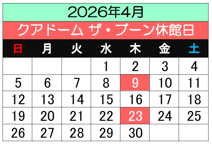 - 上記日程において施設メンテナンスのため休館いたします。お客様におかれましては大変ご迷惑をおかけいたしますが、何卒ご了承お願い申し上げます。